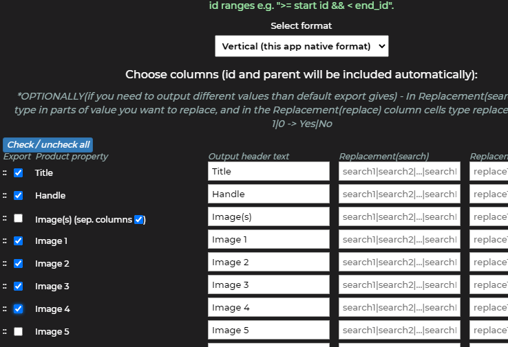 [NARRATOR Selects Vertical format. NARRATOR RE-ORDERS ITEMS OF EXPORT BY DRAGGING THEM TO BE LIKE ON NEXT IMAGE - title, handle, images ]
