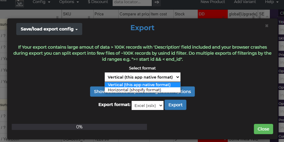 We have an option of selecting a format of data which can be like the default view of an app called “Vertical” or it can be like Shopify default import/export format called “Horizontal”.