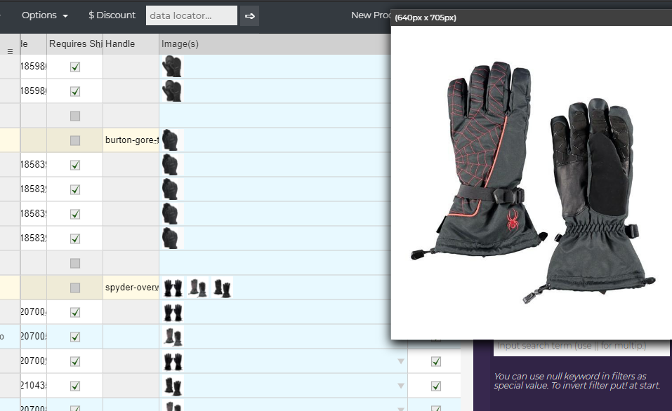 This app, offers you a visual GUI that enables you to easily spot problems , in lage catalogs. Images column , actualty shows us the images [NARRATOR shows the image column. NARRATOR scrolls up / down] . Once we hover over any of them , we get an large preview [NARRATOR hover with mouse over some images cell to show image preview feature ] .