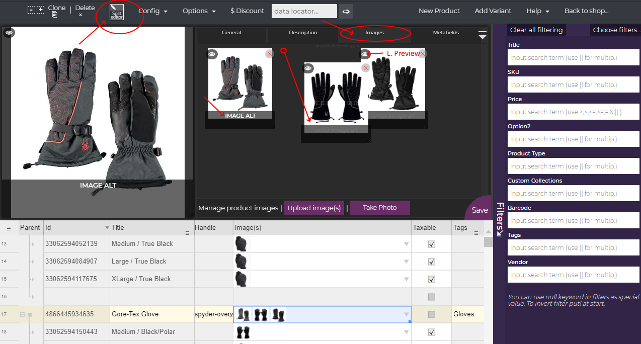 If you use a split details editor, we can get even more options [NARRATOR toggles split editor (while staying on the same product ] [NARRATOR opens the “Images” tab of spit editor] .