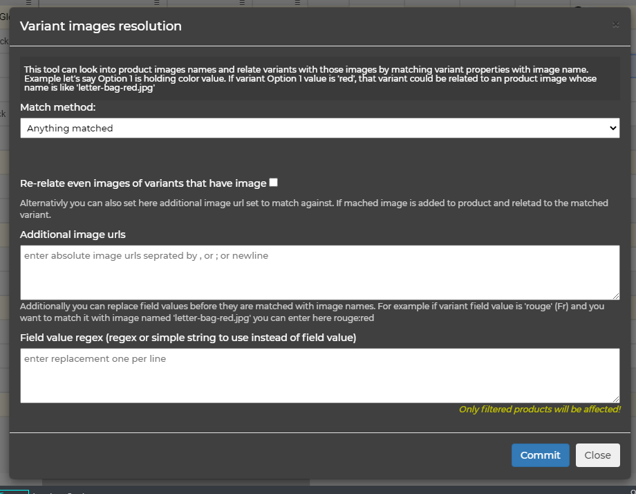 [NARRATOR opens Options->’Images resolve for filtered variants’] We can select a matching method here [NARRATOR shows ‘Match method’ field]. We can choose if we want a broad matching, or exact matching by selecting one of the three offered methods. I will use exact comparison by option 2 in may case. I will not enter anything in ‘Additional image urls’ because in the first go I want to show you that this tool also can distribute images that are already uploaded for a product to its variants.