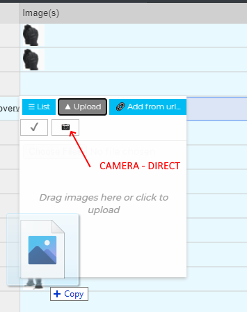 [NARRATOR opens ‘Upload’ tab] See here that we have the option to add images from our computer, this list accepts images from drag-and-drop feature. If we have a camera, we may take a picture immediately [NARRATOR shows camera icon] ,